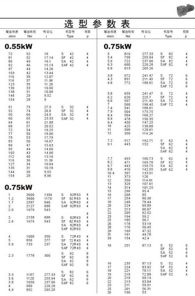 选型参数表0.55kW(续)和0.75kW