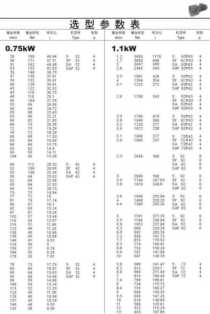 选型参数表0.75kW(续)和1.1kW