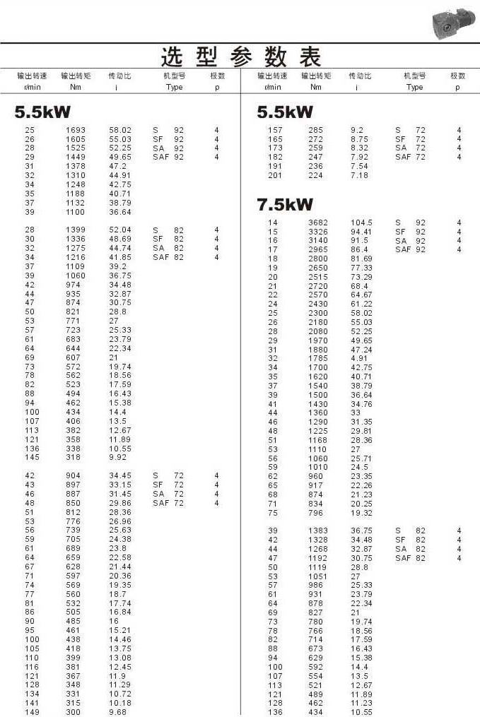 选型参数表5.5kW(续)和7.5kW
