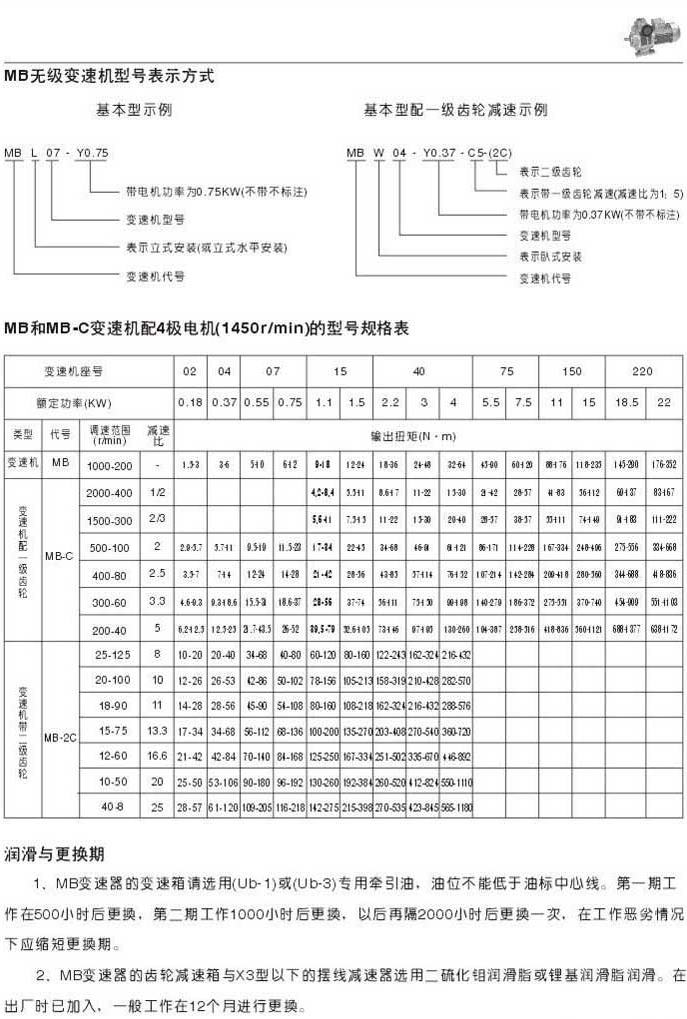 MB无级变速机型号表示法MB和MB-C变速机配4极电机(1450r/min)的型号规格表润滑和更换期