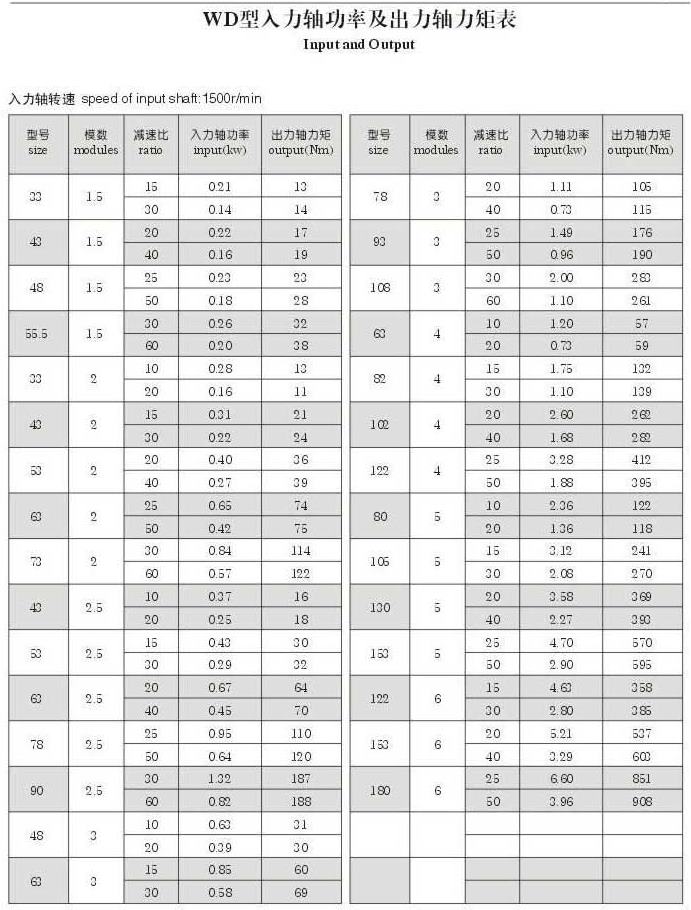 WD型入力轴功率及出力轴力矩表