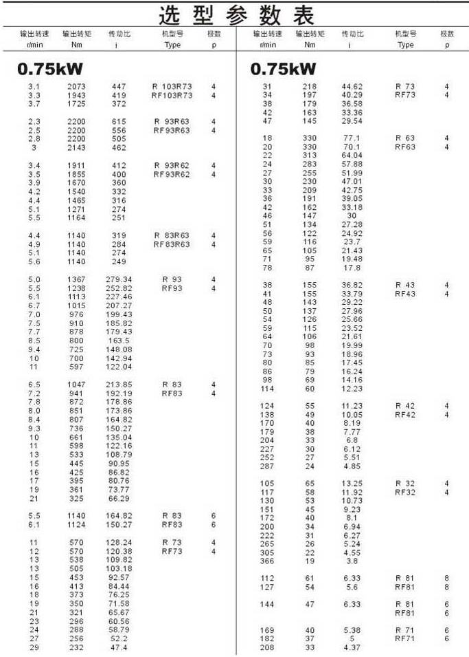 选型参数表0.75kW(续)